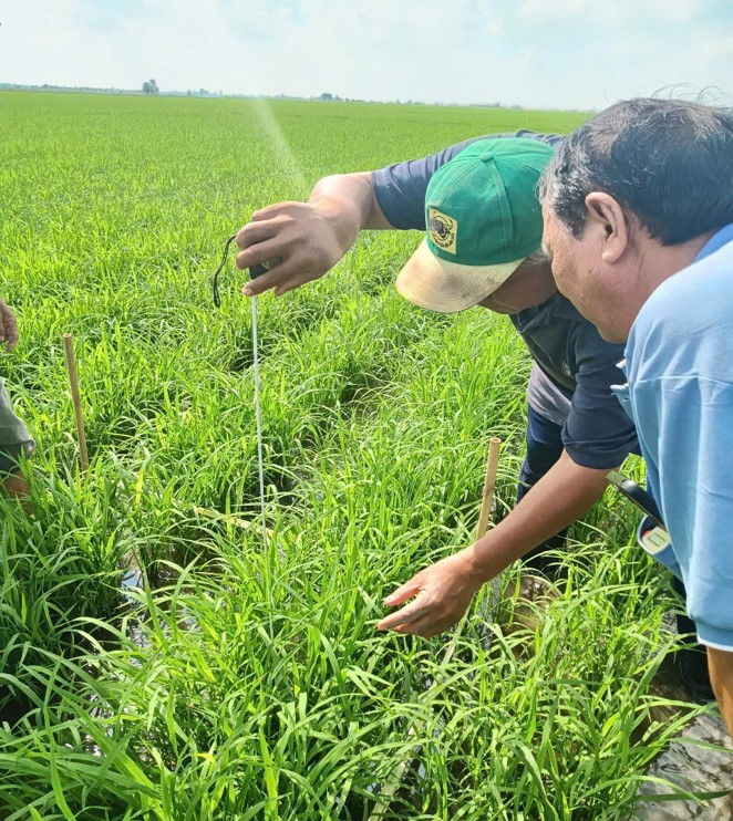 Tại điểm thực hiện mô hình với diện tích 50 ha, có 11 hộ tham gia, lượng giống gieo sạ: 70 kg/ha và áp dụng kỹ thuật thuộc quy trình 145 của cục trồng trọt và BVTV ban hành, mô hình áp dụng kỹ thuật sạ hàng kết hợp vùi phân và quản lý dinh dưỡng cân đối, hiệu quả và tiết kiệm.