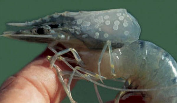 Dấu hiệu: Râu bị đứt 1 phần hoặc toàn bộ; phần đuôi, chân bị ăn mòn; tôm ăn yếu, dạt bờ, hoạt động khó khăn; màu sắc tôm thay đổi, chuyển sang màu hồng bắt đầu từ các phần phụ, sau đó chuyển sang toàn thân.