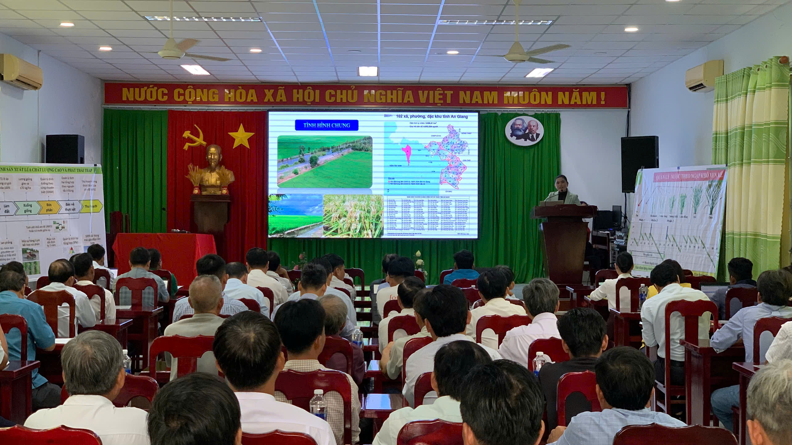 Bà Thị Tú Linh – Phó phòng Khuyến nông – TTKN An Giang đang trình bày khái quát tình hình nông nghiệp của tỉnh An Giang sau sáp nhập.