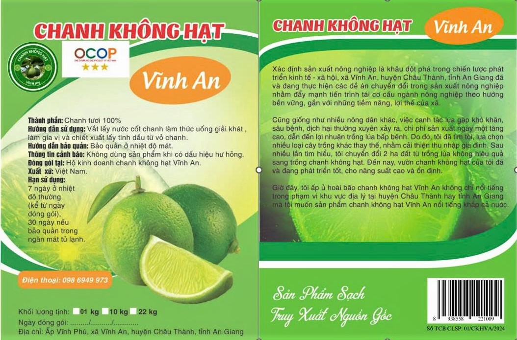 Cùng với sự phát triển về thương hiệu, việc xây dựng logo, bao bì nhãn mác chuyên nghiệp, mã vạch truy xuất nguồn gốc cũng thực hiện tốt. Năm 2024 đã đăng ký Chanh không hạt Vĩnh An và đạt chuẩn OCOP 3 sao. Đây là cơ hội để đưa sản phẩm chanh ra thị trường rộng lớn hơn, mở ra hướng đi mới không những giúp nâng cao giá trị sản phẩm mà còn tạo cơ hội vươn xa cho chanh không hạt Vĩnh An trên thị trường quốc tế, nhất là trong bối cảnh nhu cầu tiêu dùng thực phẩm an toàn, chất lượng cao đang ngày càng tăng.