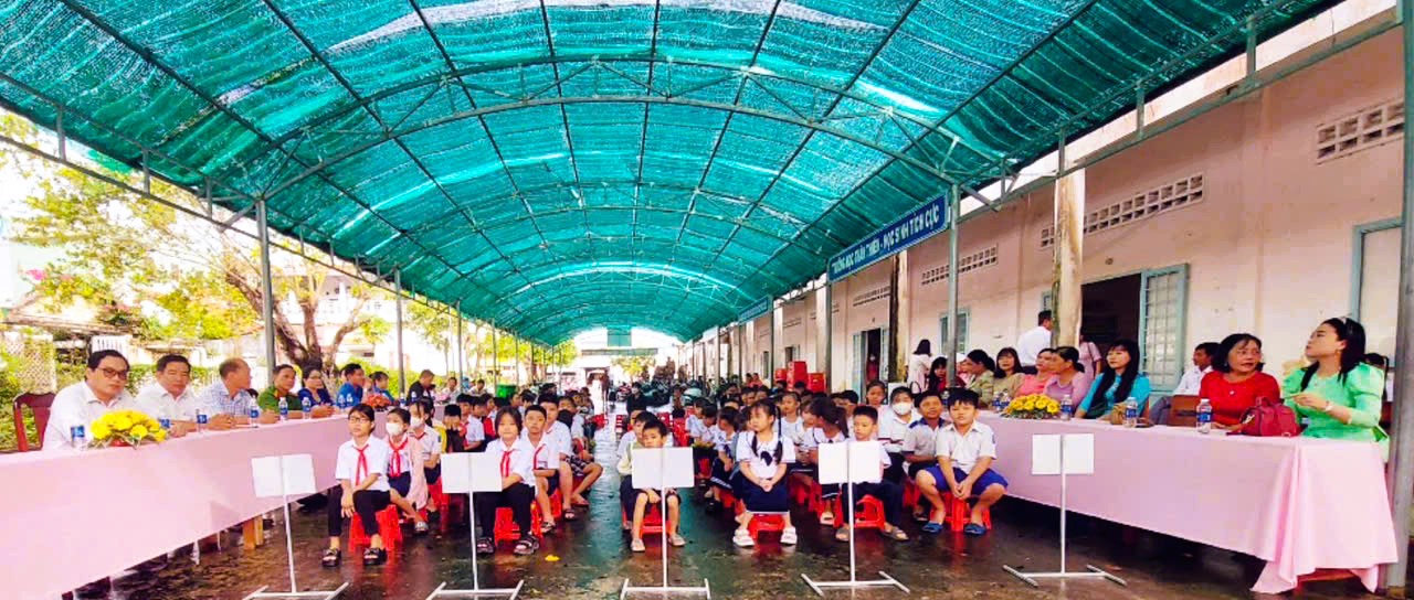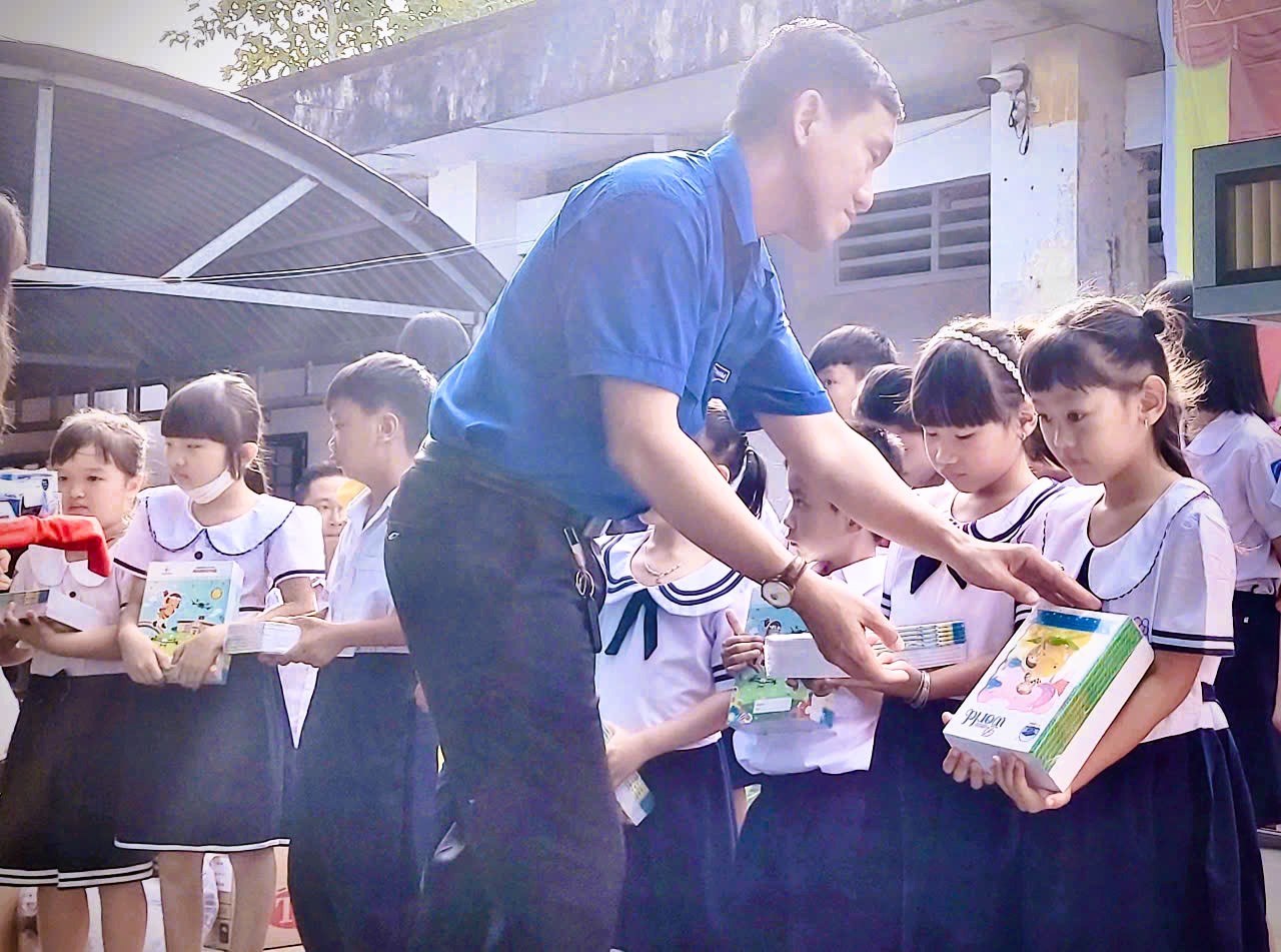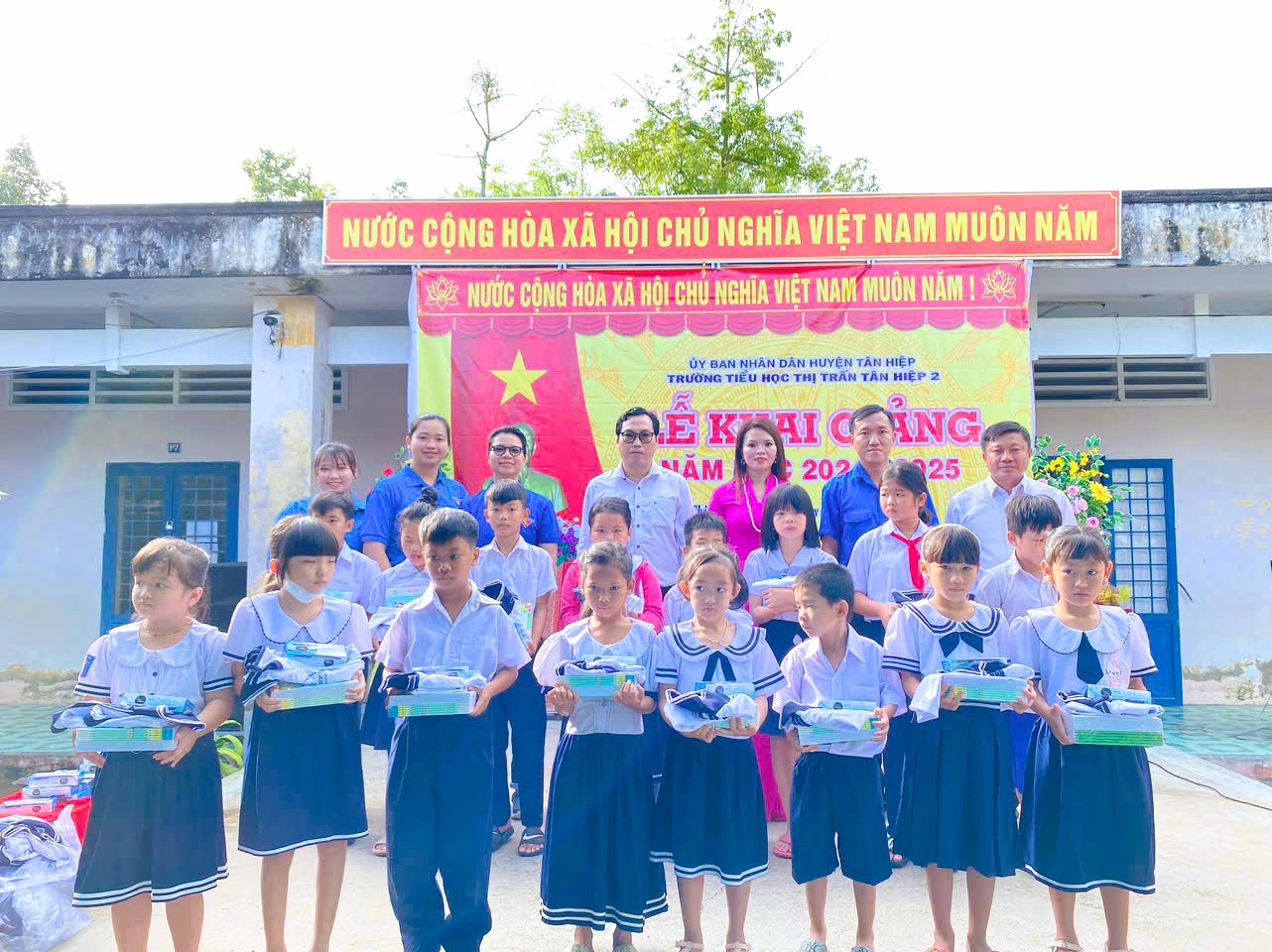 Tại trường tiểu học thị trấn Tân Hiệp 2, huyện Tân Hiệp, Chi Đoàn trao tận tay đến các em học sinh 30 phần quà, mỗi phần gồm 10 quyển tập, 1 hộp viết và 1 bộ đồ thể dục. Những phần quà này là nguồn động viên quý báu, giúp các em vững bước trên con đường học tập, đồng thời thể hiện sự quan tâm, chia sẻ đầy ý nghĩa từ Đảng bộ Bộ phận và Chi Đoàn Trung tâm Khuyến nông tỉnh Kiên Giang.