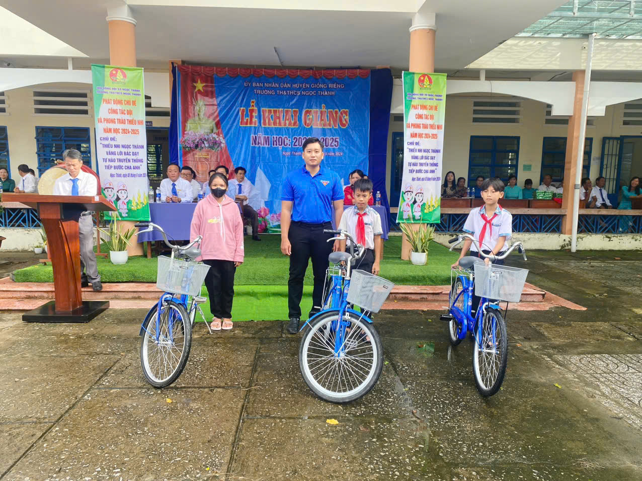 Không chỉ dừng lại ở đó, Chi Đoàn cũng đã trao tặng 3 chiếc xe đạp cho các em học sinh tại trường tiểu học và trung học xã Ngọc Thành, huyện Giồng Riềng. Những chiếc xe đạp này không chỉ giúp các em đi lại thuận tiện hơn mà còn là món quà động viên tinh thần lớn lao, góp phần giảm bớt khó khăn trong việc đến trường.