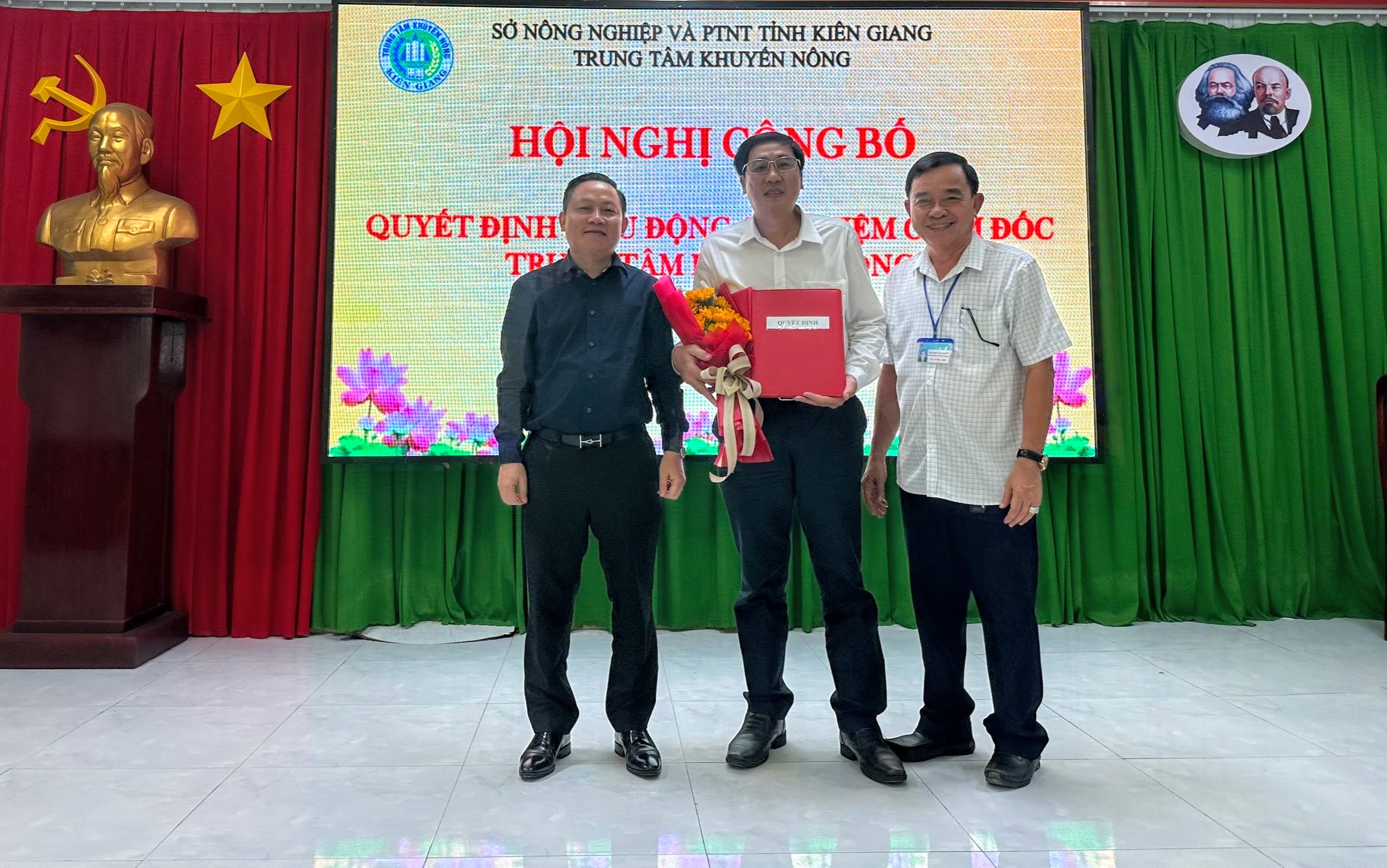 Ông Lê Hữu Toàn, Bí thư Đảng ủy, Giám đốc Sở Nông nghiệp và PTNT Kiên Giang (Bên trái); Ông Huỳnh Văn Nhứt – Phó Bí thư Đảng ủy Sở Nông nghiệp và PTNT (Bên phải) trao quyết định và tặng hoa chúc mừng tân Giám đốc TTKN Kiên Giang
