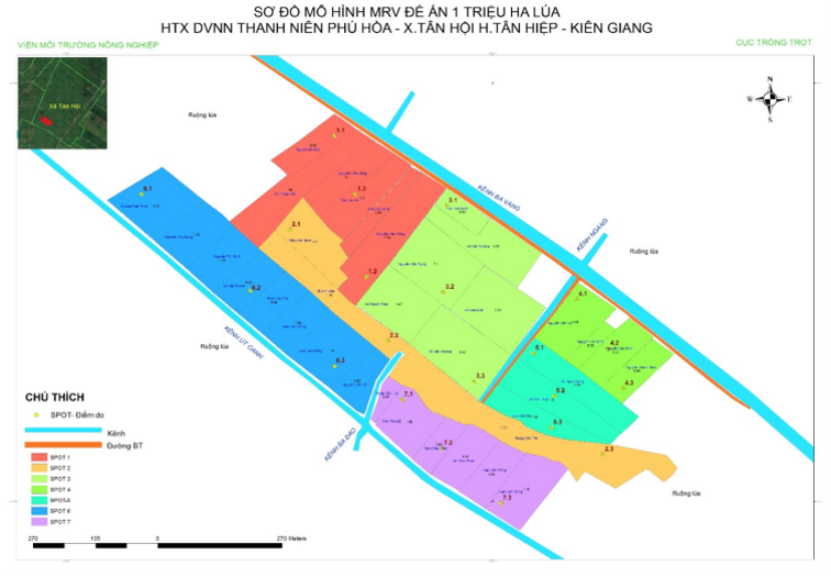 Để giảm phát thải trong canh tác lúa, mô hình áp dụng rút nước theo nguyên tắc ướt khô xen kẽ (AWD), thực hiện theo sự hướng dẫn, giám sát của Viện Môi trường Nông nghiệp, bố trí tổng khu đo dạc MRV (Spot): 7 spots * 3 vị trí = 21 (điểm đo).