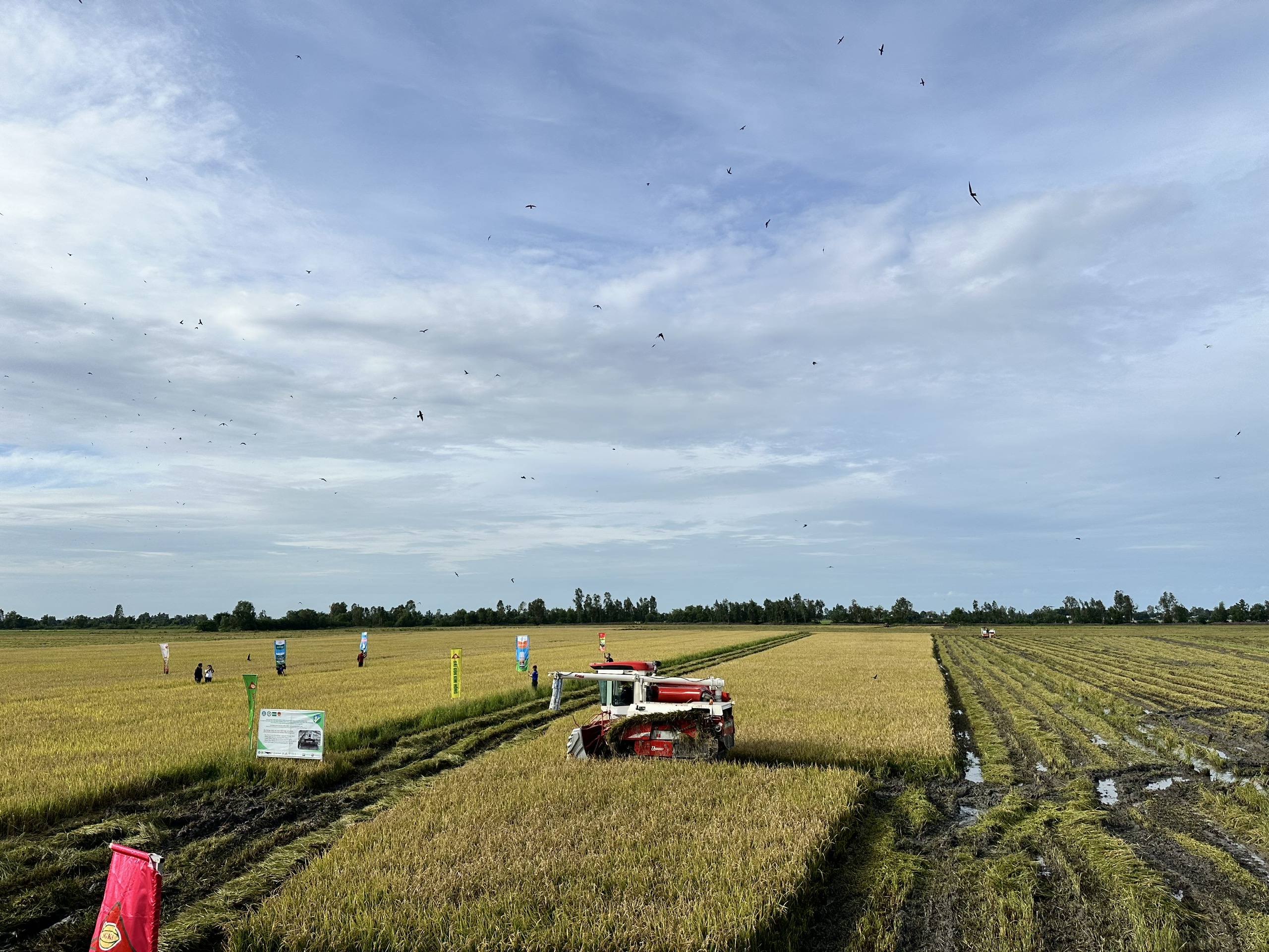 Trình diễn cơ giới hóa sau thu hoạch trên cánh đồng canh tác lúa chất lượng cao, phát thải thấp.