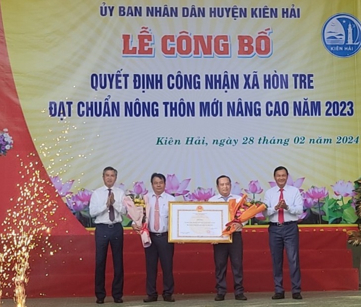 Ngày 28 tháng 02 năm 2024 xã Hòn Tre, huyện Kiên Hải, được Uỷ ban Nhân dân tỉnh Kiên Giang trao quyết định “Xã đạt chuẩn nông thôn mới (NTM) nâng cao”. Buổi lễ được diễn ra tại Ủy ban Nhân dân huyện Kiên Hải, tham dự có Ông Nguyễn Lưu Trung Tỉnh ủy viên, Phó chủ tịch Ủy Ban tỉnh Kiên Giang; Ông Lê Hữu Toàn, Giám đốc Sở Nông nghiệp – PTNT tỉnh Kiên Giang, đại diện các lãnh đạo các ban ngành của tỉnh, huyện và đại diện nhân dân trên địa bàn xã.