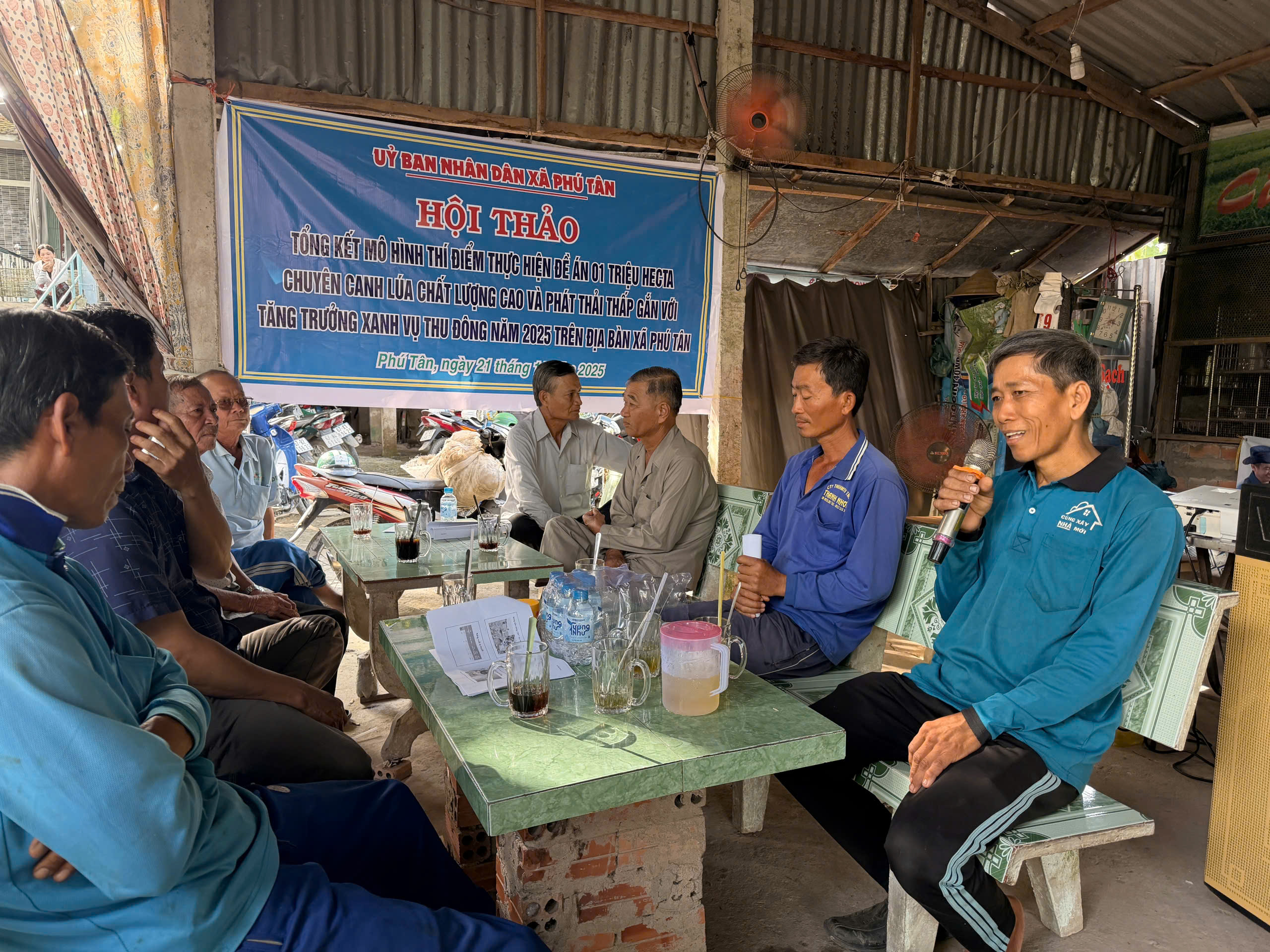 Ngày 21/11, Phòng Kinh tế UBND xã Phú Tân đã tổ chức thành công hội thảo tổng kết đánh giá hiệu quả vượt trội của mô hình thí điểm thực hiện theo Đề án 01 triệu hecta chuyên canh lúa chất lượng cao và phát thải thấp gắn với tăng trưởng xanh vụ Thu Đông năm 2025, ghi nhận năng suất và giá bán ấn tượng tại ấp Hưng Hòa. Tham dự hội thảo có ông Giáp Minh Triết, Phó Chủ tịch UBND xã Phú Tân và đại diện phòng Kinh tế; Hội Nông dân; Trạm Kỹ thuật Nông nghiệp khu vực, cùng đại diện các công ty; Hợp tác xã và gần 100 nông dân trong vùng tham gia mô hình đến dự.